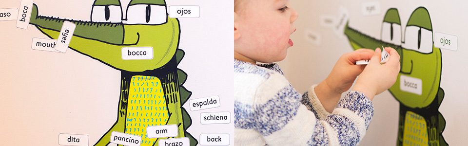 We are always busy designing and testing new products. Pictured here is ‘crocobody’ a big, friendly crocodile wall sticker with labels in as many languages as you would like to show different parts of his body. The labels are made from the magic ‘Easy Tack’ material and can be stuck, moved and re-stuck multiple times without marking or losing their stick.