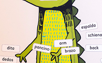 We are always busy designing and testing new products. Pictured here is ‘Crocobody’ a big, friendly crocodile wall sticker with labels in as many languages as you would like to show different parts of his body. The labels are made from the magic ‘Easy Tack’ material and can be stuck, moved and re-stuck multiple times without marking or losing their stick.