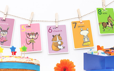 Would you like to say ‘Feliz cumpleaños!’ or maybe ‘Bon anniversaire!’? Say ‘Happy Birthday’ in English and another language for ages 1 - 10. Each year has two different bright animal designs to choose from. Please scroll down to see and buy all 20 designs.