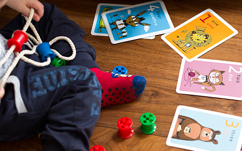 Alternatively lay the cards or a poster out and find toys or objects that match the number on each card. Marco enjoys counting coloured bobbins onto a string and also talks about the different animals on the numbers cards.
