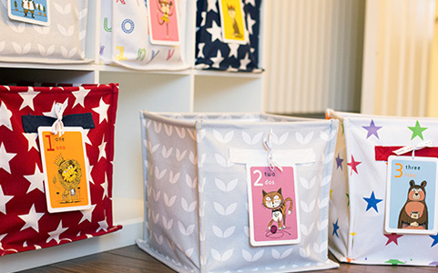 We put them on boxes and drawers and count balls in and out but you can do this with anything you like, such as toys, clothes and shoes. This can (sometimes) double up as a fun way to tidy up!