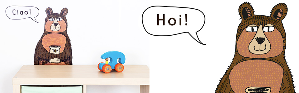 How would you like to say hello? ‘Hi Bear’ says hello in all the current Lil’ollo languages, a great addition to any room. Hi Bear is approximately 66 by 66cm and made from an easy to apply material. It can be moved, repositioned and removed easily without marking.