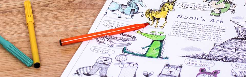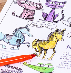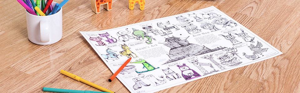 There are lots of animals on their way to the ark; cats, horses, lions, crocodiles and many more! Can you find them all and colour them in? There is so much to talk about with animals, numbers, colours and a big boat. When the artwork is finished how about playing a game? Have a look at our games guide for some ideas.